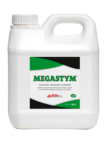 MEGASTYM® is a fluid protein concentrated of completely plant origin with a high content of free amino acids (31%) vitamins and chelated microelements. Iron is fundamental in photosynthesis, Zinc stimulates fruit set and young tissues reproduction and Manganese is an important catalyser in enzymatic processes. Thanks to a patented enzymatic hydrolysis process, proteins and amino acids are preserved. The innovation of MEGASTYM® is the supply of 418 gr/l of free amino acids in laevorotatory form with a low molecular weight (maximum 200 dalton), quickly absorbable. The plant in this way do not need to break peptide bonds to make available the amino acids allowing a huge energetic saving on all processes of protein, enzyme and sugar biosynthesis; both in normal and stress conditions.