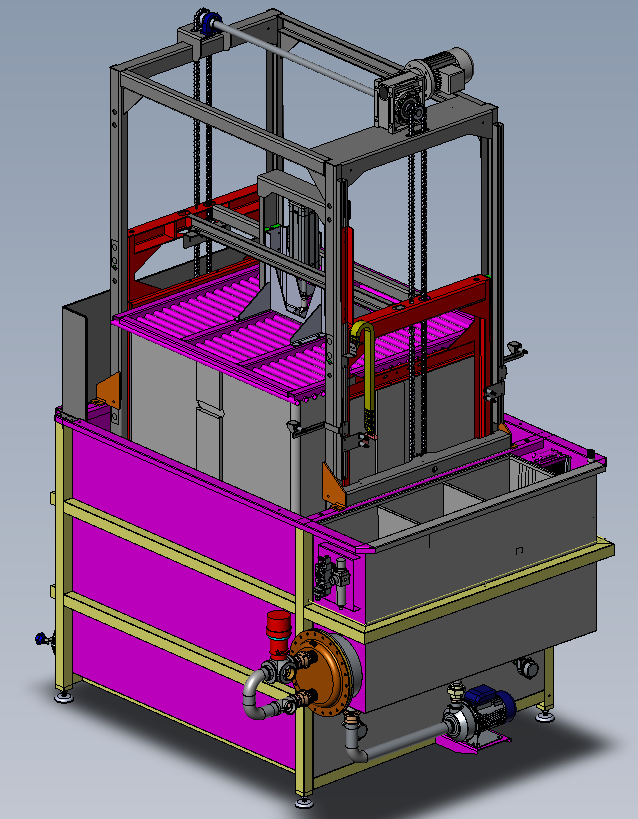 Con la VASCA AD IMMERSIONE SINGOLA VTF1 la pila di bins da trattare viene posta sul trasportatore per giungere sul decatastatore. I bins così singolati sono inviati all’immergitore. Nell’immergitore viene dapprima stretto il bins da un cappellosuperiore e successivamente viene attivata la discesa all’interno della vasca contenente l’acqua. I frutti contenuti nel cassone vengono cosi esposti all’acqua. Ad ogni impulso prestabilito, avvengono delle salite/discese in modo da muovere i frutti e diminuirei punti di contatto che non sarebbero esposti. Al termine del tempo di trattamento impostato, il cassone si riporterà in posizione iniziale e trasferito sul trasportatore di sgocciolamento. I bins sgocciolati sono inviati all’accatastatore dove vengono rimpilati per essere portati via. Degli agitatori posti all’interno della vasca permettono una miscelazione dell’acqua.