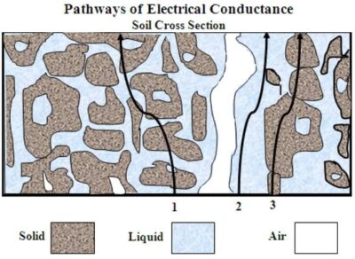 La conducibilità elettrica misurata dal sensore è quella definita come ‘totale’, ovvero la conducibilità elettrica del terreno con tutte le sue varie componenti (acqua, terreno, aria). Questa conducibilità viene indicata come ECB.